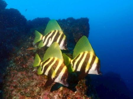 まいど~まるちゃんです 『住崎』の本根回りに行けば、たいがい見れ 多い時は7~8匹まとまっておりワイド派おすすめの被写体です 本種は北海道から本州・九州・小笠原諸島・八丈島・沖縄県などに広く分布しており、どこの海でも生活できるオールラウンダーです 比較的、寄りやすいので魚の表情を捉えやすいです 【写真に一言】 外部ストロボを一切使わず水中ライトオンリーで撮った写真です 背景は海で抜きつつテングダイの体色が綺麗に出てます お見事 明日は久しぶりに串本でガイド ほな さいなら
