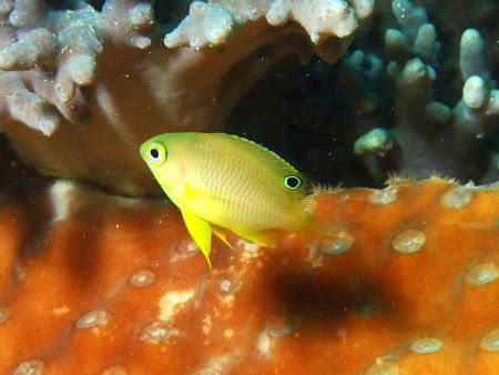 まいど~まるちゃんです ネッタイスズメダイとニセネッタイスズメダイの見分け方っす 【ネッタイスズメダイ】 胸ビレ付け根の黒点は小さく体色は鮮やかな黄色 【ニセネッタイスズメダイ】 胸ビレ付け根の黒点が大きく体色がやや青みがかった黄色 幼魚時に背ビレに眼状斑がある。 両種共に沖縄の海では普通種やけど串本の海では超レア種 僕は、串本では見たことありまへん 個人的にはニセネッタイスズメダイの方が好きっす 【写真にひとこと】 綺麗な体色やぁー 幼魚特有の背ビレの眼状斑もばっちり 白トビしそうなギリギリラインでストロボ光を抑えてるとこがナイス~ ほな さいなら