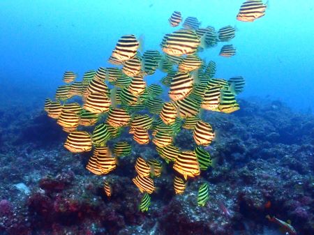 まいど~まるちゃんです 『住崎』の本根回りに行けば、たいがい見れ 多い時は7~8匹まとまっておりワイド派おすすめの被写体です 本種は北海道から本州・九州・小笠原諸島・八丈島・沖縄県などに広く分布しており、どこの海でも生活できるオールラウンダーです 比較的、寄りやすいので魚の表情を捉えやすいです 【写真に一言】 外部ストロボを一切使わず水中ライトオンリーで撮った写真です 背景は海で抜きつつテングダイの体色が綺麗に出てます お見事 明日は久しぶりに串本でガイド ほな さいなら