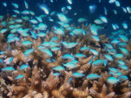まいど~まるちゃんです 美ら海と言えば・・・癒しの空間 白い砂地にデバスズメダイの群 僕の勝手なイメージですが 因みに串本の海でデバスズメダイを見つけたら レア種となります 【ひとこと】 フィッシュアイレンズを装着して被写体に寄る ストロボ一灯でバランス良く光を回すため ワイドマクロで群れ全体の色を出しつつ群れ感も お見事 今日と明日は私用のため臨時休業となってまーす すんません ほな さいなら